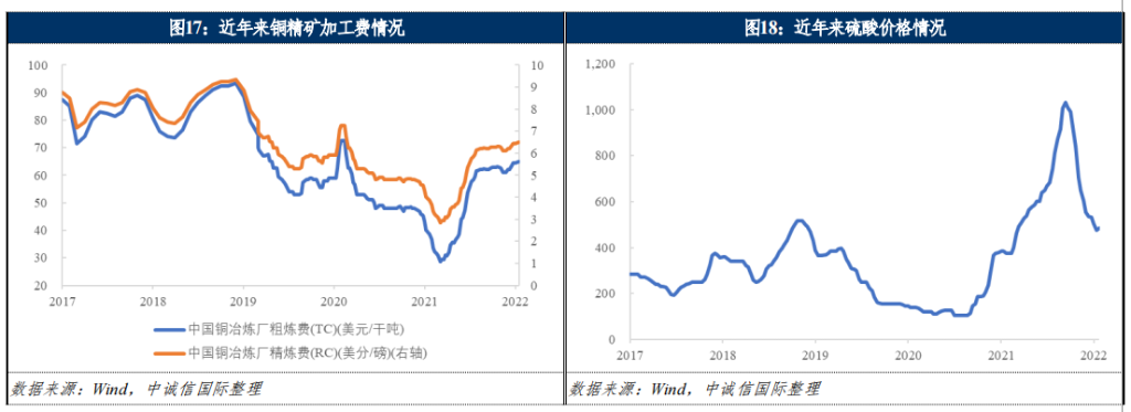 2021年12月16日,,, ,江西铜业、铜陵有色、中国铜业、金川集团与Freeport确定了2022年铜精矿长单加工费(TC/RC)为65美元/6.5美分,,, ,较2021年上涨5.5美元/0.55美分,,, ,竣事了2015年以来加工费逐年下降趋势,,, ,叠加2021年以来硫酸价钱的大幅回暖,,, ,冶炼厂盈利能力提升,,, ,头部企信用质量有望一连提升。。不过头部企业的谈判价钱为Benchmark价钱,,, ,冶炼厂现实赚取的加工费与其仍有一定差别,,, ,弱资质企业享受谈判价钱上升的边际效应有所削弱。。