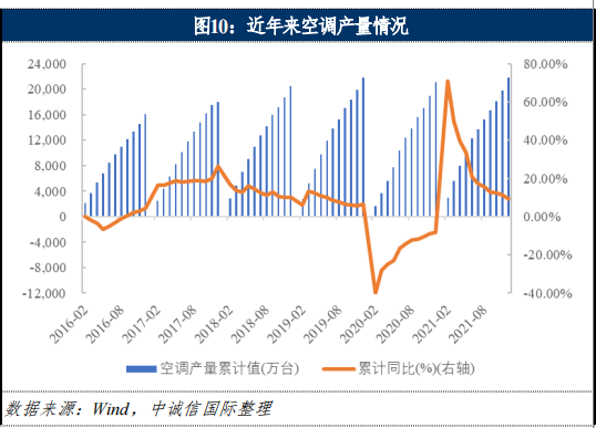 从空调方面来看,,, ,2021年空调产量2.18亿台,,, ,同比增添9.40%,,, ,与2019年基本持平略有增添。。上游方面,,, ,地产增添并未显着下降,,, ,加之租房市场设置也有一定需求,,, ,基本盘较为稳固。。下游方面,,, ,市场仍有较大基数的置换需求,,, ,另外我国作为全球制造业中心,,, ,肩负着全球需求的供应,,, ,空调解体对铜仍保存较大需求。。
